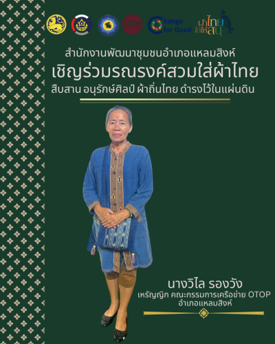 สำนักงานพัฒนาชุมชนอำเภอแหลมสิงห์ ขอเชิญทุกท่านร่วมแต่งกายด้วยผ้าไทย เพื่อร่วมกันอนุรักษ์และส่งเสริมศิลปวัฒนธรรมไทยอันทรงคุณค่า