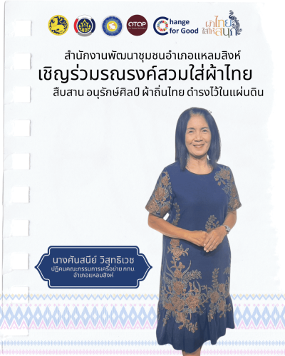 สำนักงานพัฒนาชุมชนอำเภอแหลมสิงห์ ขอเชิญทุกท่านร่วมแต่งกายด้วยผ้าไทย เพื่อร่วมกันอนุรักษ์และส่งเสริมศิลปวัฒนธรรมไทยอันทรงคุณค่า